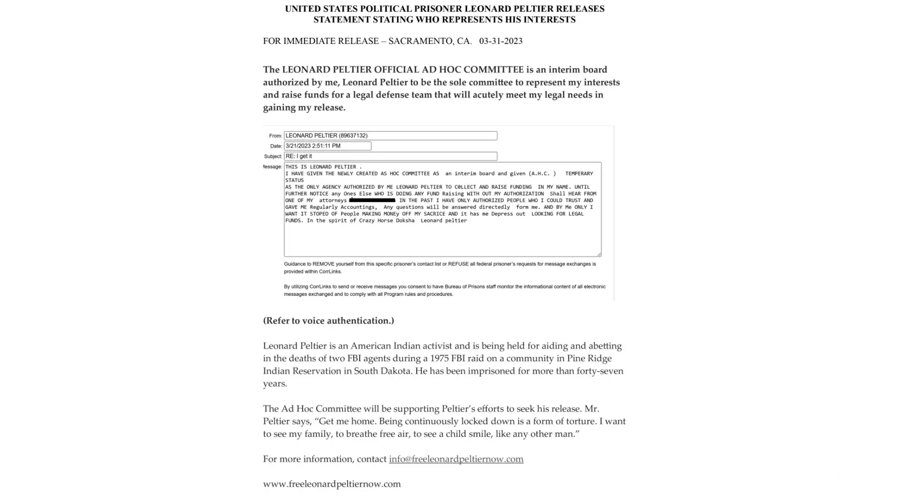 This statement is false. They are not in contact with Mr. Peltier. He is 78-years old with serious health conditions and they are using the website to legitimize their illegal activity and jeopardize efforts to gain his release.