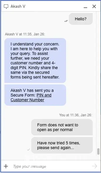 Jan 26th, still no change. Chat (back with Akash V) when he realised it was me, once again, he terminated the chat as soon as he could.