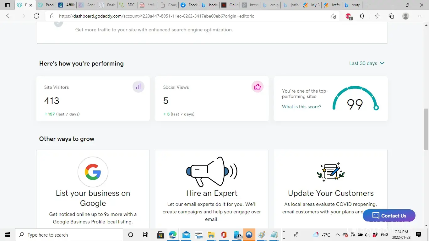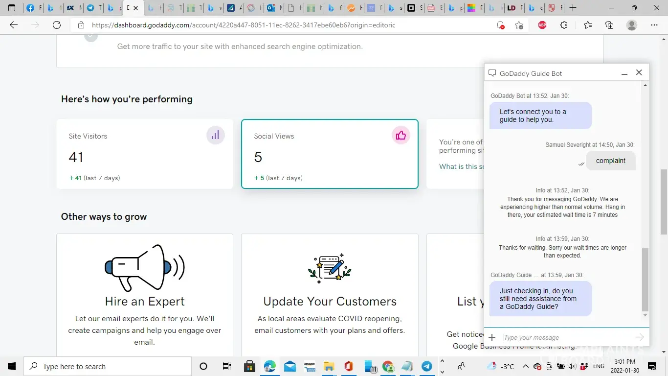 goDaddy's analytics meausment failed on Jan 28 2022 I was lucky enough to take a screenshot on my facebook because I was proud, it was posted some time Jan 28. I was supposed to make a $1500 pitch on Jan 31. I had well over 500 visitors and now it only showing 40, I would of met the amount of traffic needed to get the money I cannot provide the data now, because I no longer can provde investor information of the proper analtytics due to condition that was he had to see it live on godaddy from a display.. Investment was supposed to be made by local business owner David rantannen, he promised payment as long as I could show I had over 450 visits. Screenshot is not accepted by the investor so I can show him data from there. I am at a considerable loss because I am unemployed and I borrowed money to begin creation of the site, I no longer can afford my rent, or any cost to continue my venture that had a high growth projection and was performing better than industry average. I have suffered undue finacial hardships due to go daddys product not performimg as advertised. it has completely ruined my business and go daddy resolution was "perhaps you would like to provide feedback" I cannot pay my rent due to this companys product failer so I demand compensation.