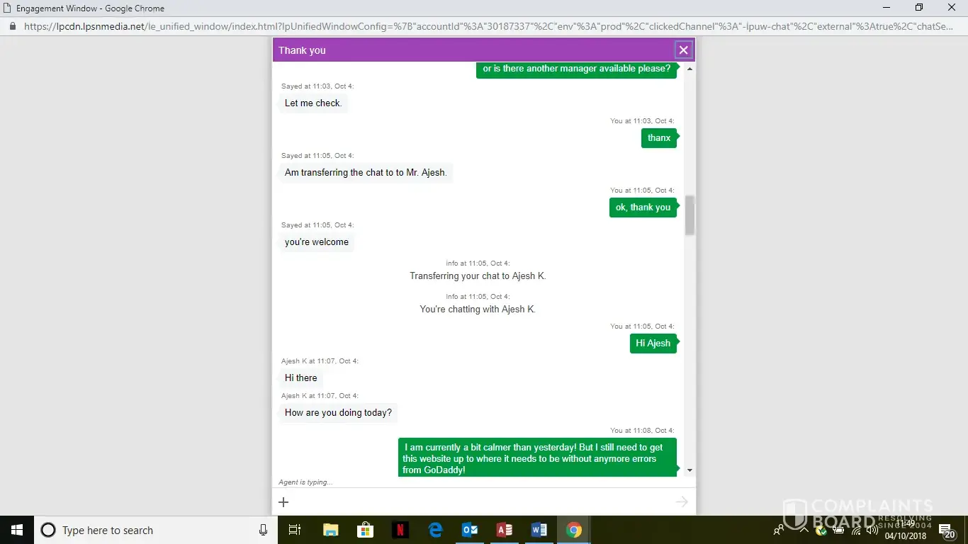 Then they forwarded my chat to some Ajesh K. Who is their supervisor as per them. He just shut the chat window on my face and left. What the *** I am supposed to do now. GoDaddy is just playing around with their customers' money.