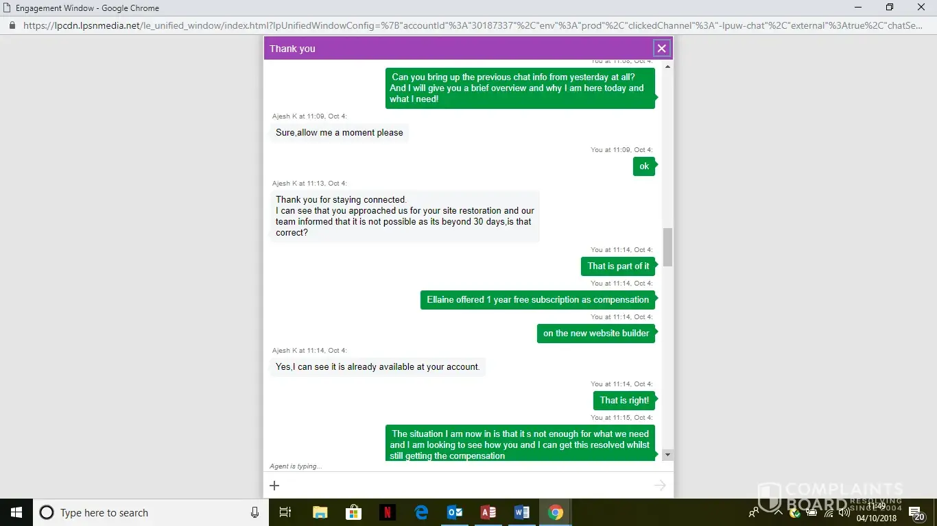 On September 21st I received a call from an Irish gentleman informing me that I should change my website manager from the one I was one (Business Plus) to a newer, faster, all round fabulous one (vNext). On hearing all the benefits, which made it sound amazing, I took this gentlemans advice and he went ahead with arranging the change. I was informed that the most I would have to do would be to copy and paste my pages from the old builder version, into the new one. My next free time (I'm self employed and run a very busy company) was the following Friday, 28th September when I had put time aside to redo the website on the new builder, which I spoke to Stefania about, and she switched the domain over to the new builder. This was done after setting up a sub-domain for the older builder version, so that I would still have access to the old version whilst working on the new one. After a few hours it became apparent that the new version was not going to give us the look and design that we wanted, and so I rang back, and luckily (Maybe?) spoke to Stefania again, who said she would switch it straight back to the old builder version, and that in doing so, my website would appear back in the old version manager, and that the sub-domain would no longer be needed.