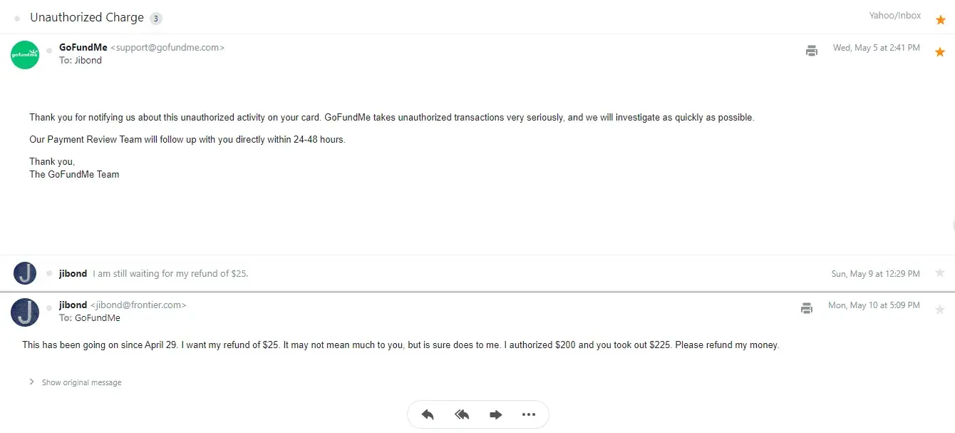 On May 9th, I replied that I was still waiting for my $25 refund. And then again on Monday, May 10, I stated that this has been going on since April 29 and that I want my refund of $25 and that it may not mean much to them, but it did to me. I authorized $200, and they took out $225.