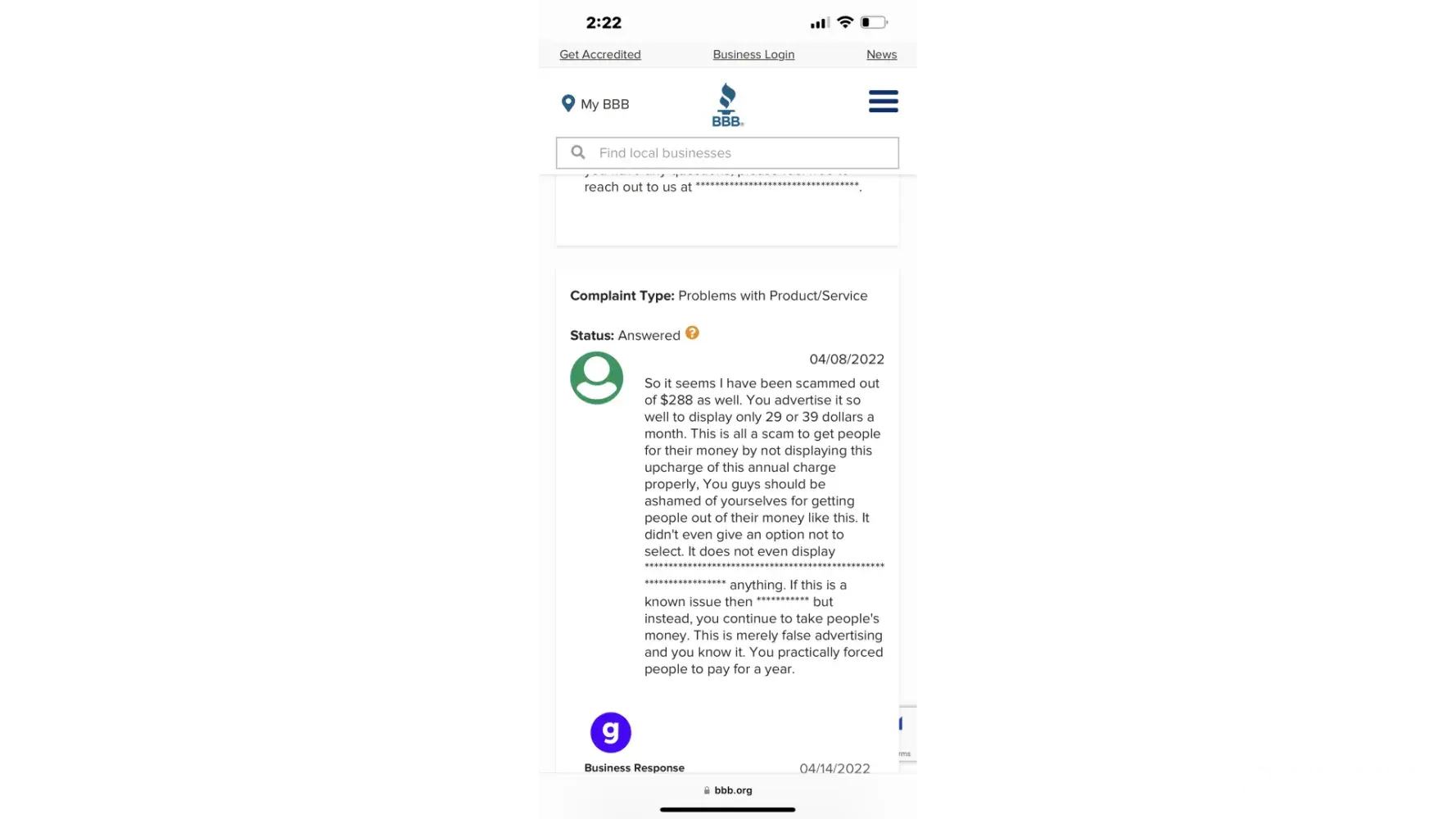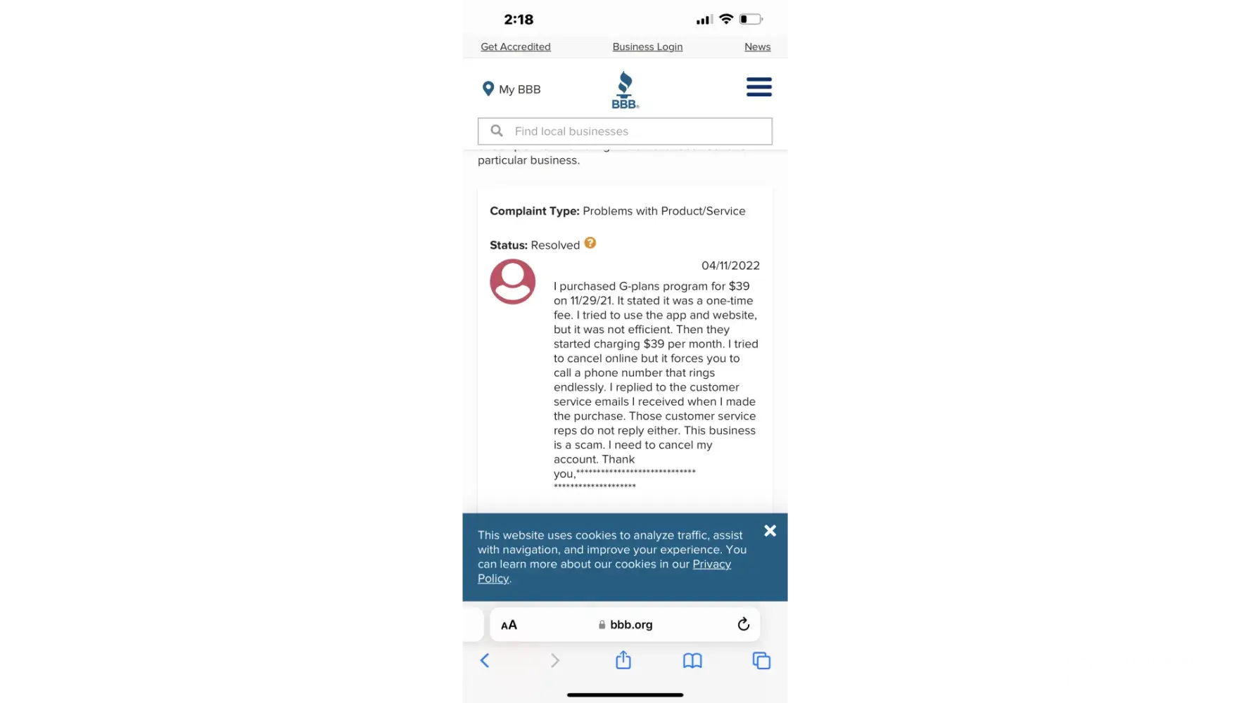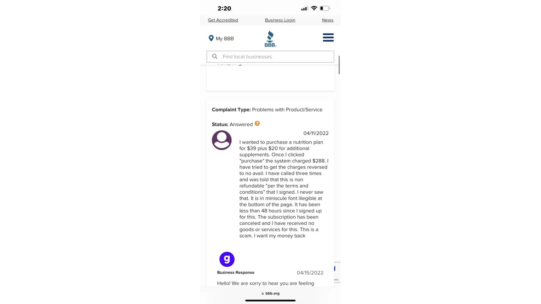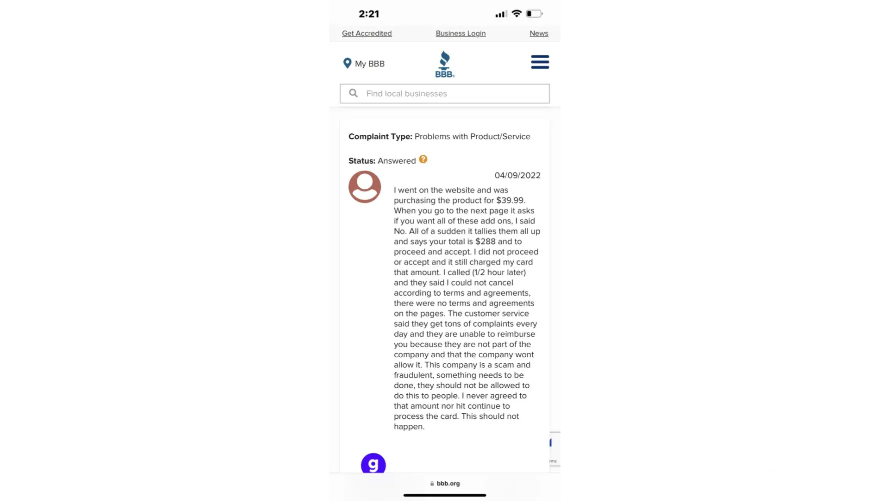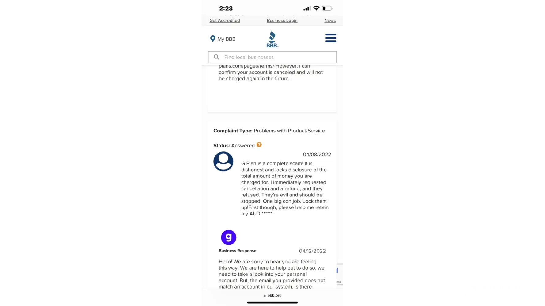 April 14th - I saw an add/quiz on G-plans. Took it, found out some interesting information and for $40 bucks I was like what's to lose, and then they hit you with this package and that package and of course the "no thank you" is so darn small (viewing it on my phone) it almost missed it. WELL.. I did miss the fact that with the $39 you don't get a membership! which as far as I can tell is required SO You can either pay their one time low fee that Is NOT refundable or pay full price... But it gets better. The options are so small that you can't even read it over a mobile and it gets worse... even if you know what you are doing you don't have the ability to REVEIW what your ultimately buying when you go from offer to offer to offer. you click complete, thinking you hit every NO THANK you and BAM your hit with a $288 bill or more depending on if you hit all the right buttons!