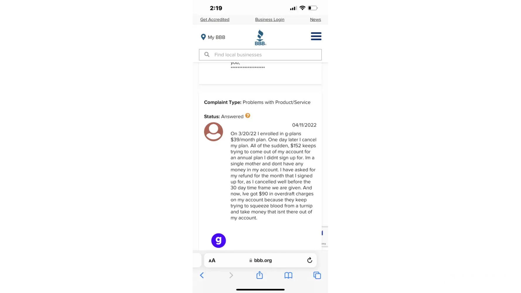 In December I bought one month of g-plans to try it out. Nowhere was it disclosed that this was an automatic monthly payment. I have no payed almost $200 because they refuse to cancel my account. I have left messages, made phone calls, and they will not return my calls or messages. I don’t know what to do. This is awful. Would not recommend!