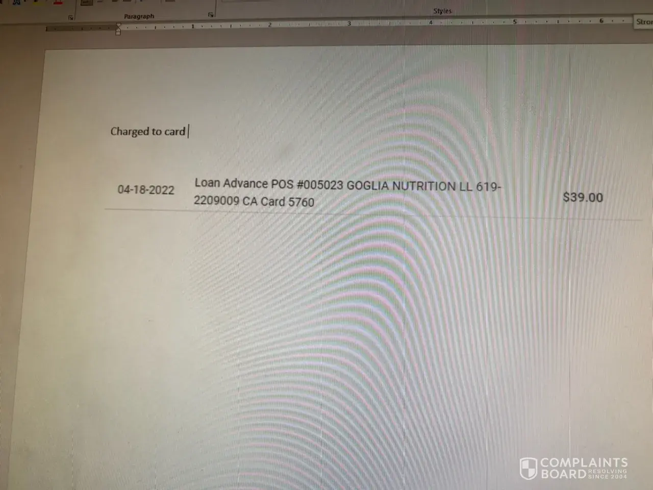 Debit: Signature purchase from [protected] GOGLIA NUTRITION LLC [protected] CA US