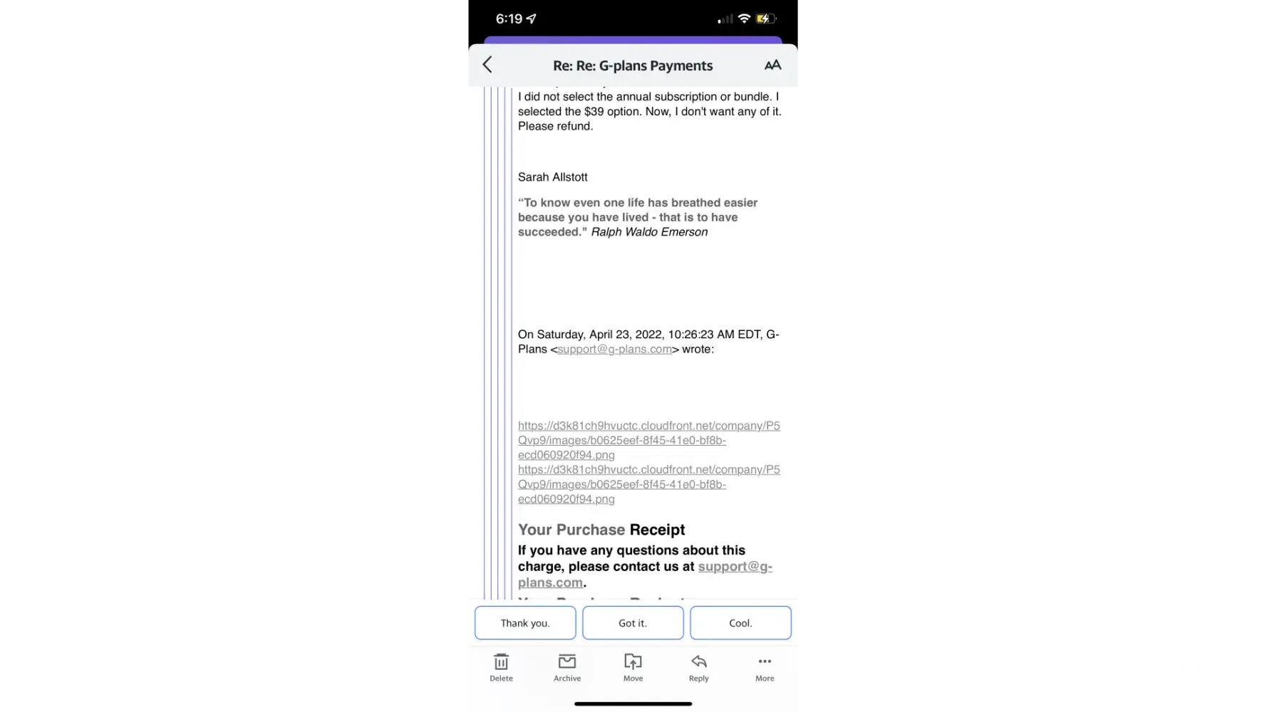 Desired outcome: Cancel subscription and refund $39, photo provides evidence that my card got charged.