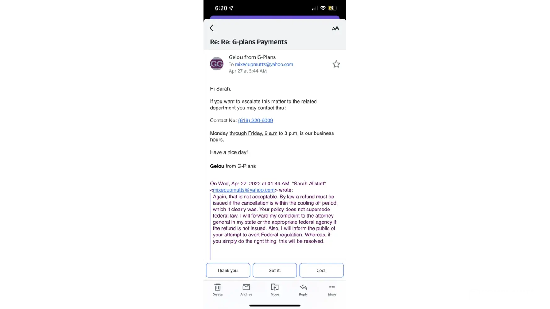 I can't phone G Plans since I'm in a different country and can't afford long-distance phone calls.
