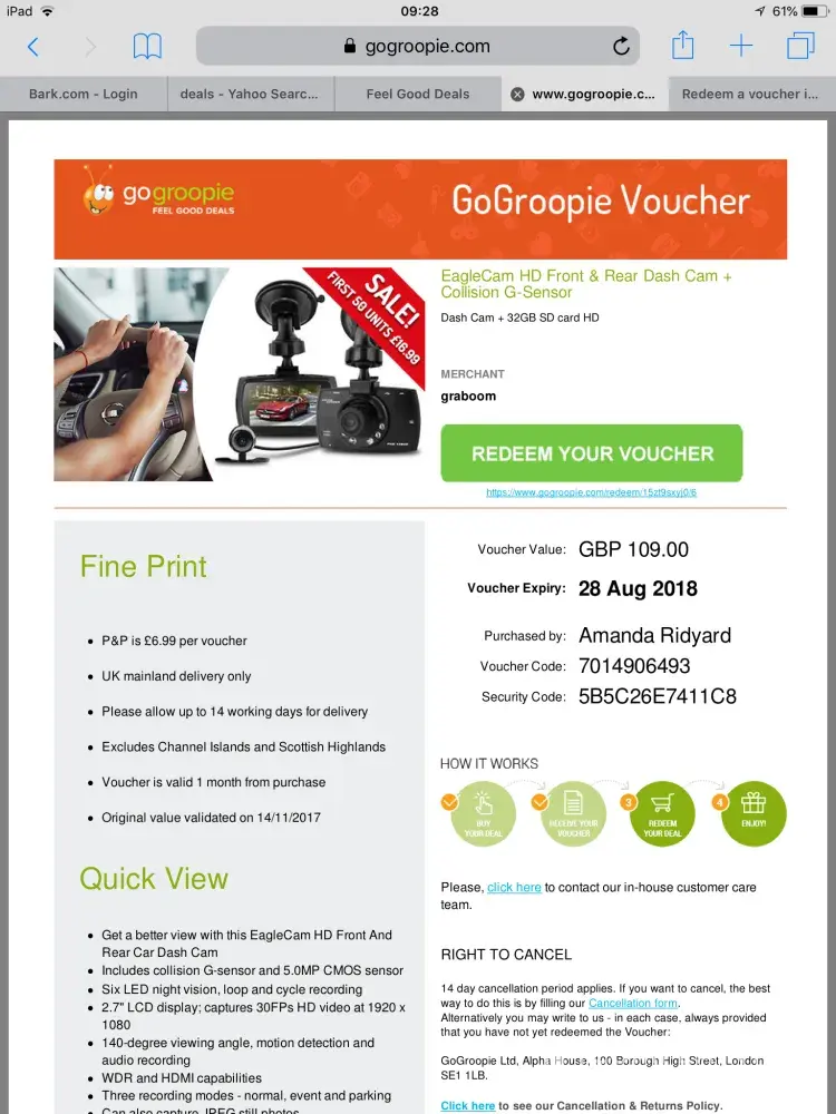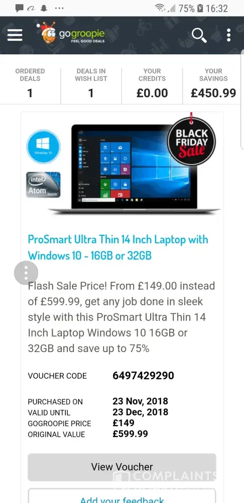 I ordered a laptop and cancelled the order along with my voucher now when I click into my orders nothing is showing up I can't even get my voucher code or anything my bank has been informed about this matter i tried contacting the merchant and gogroopie and have heard nothing back at this abosoutly shocking it's ament to be a secure account .. I would like to hear from any off you or I will be taking legal action towards gogroopie and the merchant as they have let people be scammed out off money ... I would like to hear from use asap...