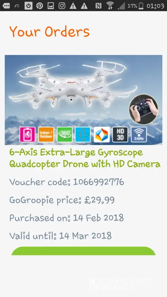 The price was £29.99 and so I paid. I also paid £9.99 for postage. I downloaded the voucher and order confirmation was sent via email. I never received a despatched email to say the item had been sent. The money came out of my bank. I bought this for my partner for his birthday. We are on a low income and on benefits. My partner cares for me full time because I am disabled and bed ridden. It took me 4 months to save up for the drone. I read on the go groopie website to allow upto 2 to 3 weeks for delivery. After three weeks I contacted go groopie and informed them the drone had not arrived. I am home everyday and not parcel had arrived. No leaflet was left in the post box to say we had missed the parcel delivery. There were no parcels in my garden, green house or out buildings or even with neighbors. My father works for royal mail and there was no parcels at the sorting office in either of our names. I got a email to say they were very sorry and that they'd contact the merchant to see what had happened. After I got a email from the merchant apologising and that the drone was sent by royal mail and to allow more time for it to arrive and if it had not arrived by the following week to contact them again. I was OK with this and gave the merchant benefit of the doubt and replied to their email and accepted this. So I left a week. And again nothing had arrived. So I emailed go groopie again and again several times and had no response until 2 weeks later. I explained the situation again and was told they would contact the merchant again. The merchant contacted me again and said the item the drone was sent again by royal mail and that it would be here by Thursday of last week. I was at home every day and again no parcel arrived, no missed parcel delivery note was left, no parcels were outside, in my green house or out buildings or with my neighbor, and again my father checked the sorting office and there was nothing there. It is now Monday and still nothing has arrived. I am deeply disappointed. I was not sent any proof of postage on both occasions nor a dispatch email. My mother recommended this website to me and my partner. He saw the drone at Christmas and fell in love with it and was very excited about receiving his new toy. Nearly 2 months on and he's lost hope and no longer wants the item. We asked for a refund on both occasions and was never given the option. This is very bad and the customer service is very poor. I will be leaving feedback. I have all emails sent and received. Also when I log into my account the order is no longer there and appears to have disappeared from my account. Before this when I tried to get infomation from the order it said the order is no longer available or a refund has been issued... please contact customer support team. I checked my bank and we have not received any refund at all. I am at my whits end and want this resolving. Please can you help. I look forward to hearing from you.