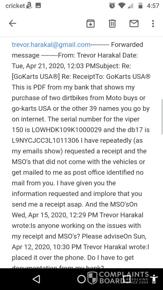 Go karts USA I called to purchase 2 vehicles. I have tried to get a receipt or bill of sales and MSO s they say were sent within 10 days. They were not as post office has no record. I got bank statement in which it says Moto buys this is the same company and crooked to hide behind many names to scam the people. I clearly called and placed a phone order with go-karts USA not Moto buys but they are the same and now telling me they have no record of sale when I have my bank statement that says almost 2,000 dollars was spent there on two dirtbikes. I want a bill of sale and mso never supplied.