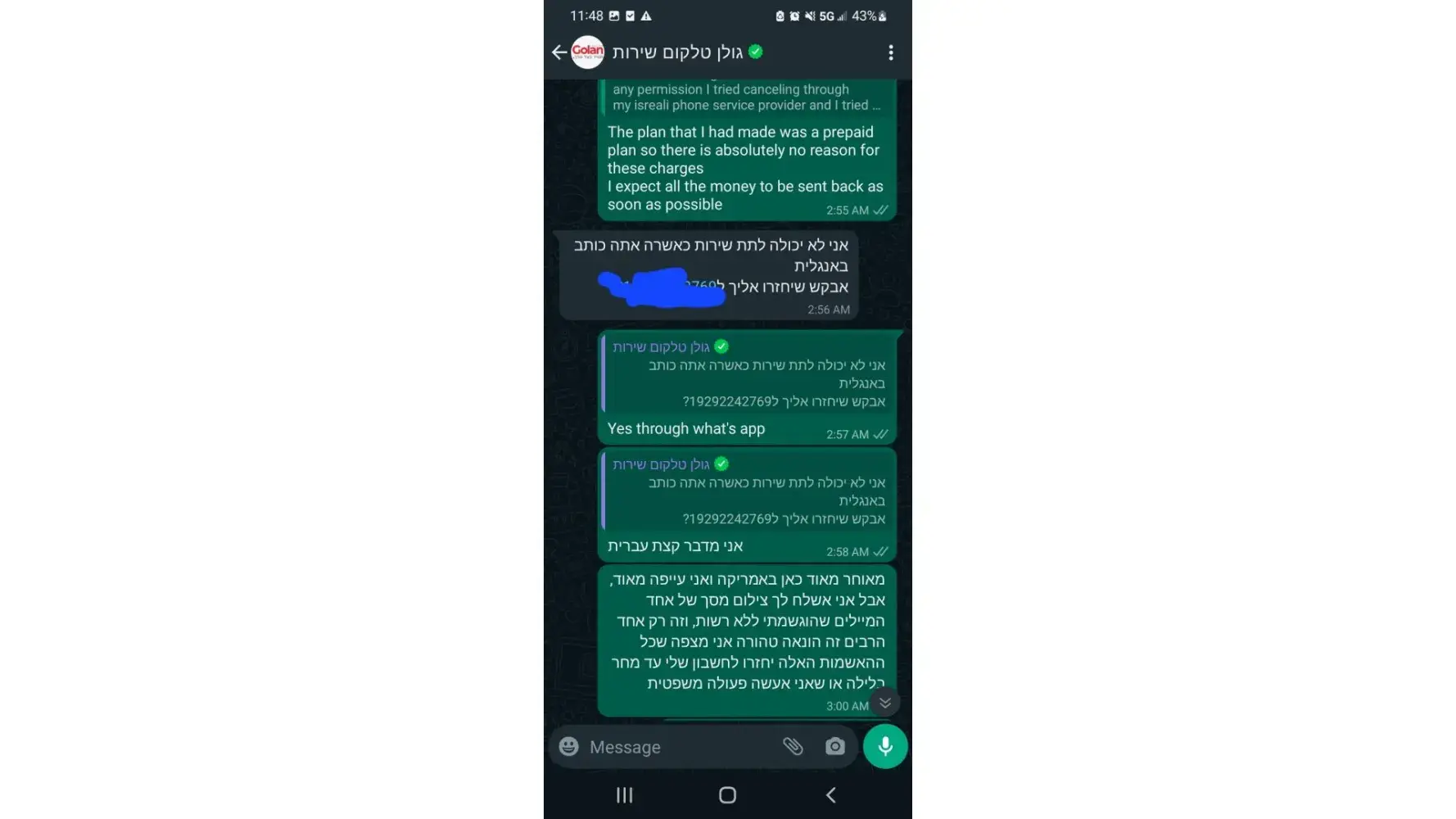 Hi I am srinivas pittala, purchased a sim card from golan telecom https://www.golantelecom.co.il/web/index.php it's not working, they charging bills from me, even without using it. My account number in golan 8063961 sim number [protected] serial number written on sim: [protected] order id: 1266818 please find herewith the attached pictures. Respond quickly and solve this problem. Call me or block the useless sim card. Call me [protected]