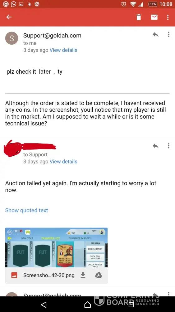 A few days ago, I had made a purchase worth $5.9. The transaction was made for player purchases in FIFA 15( android ). The first auction round yielded no results. I had contacted customer care for help. They had asked me to modify the information and re-list the player. So I did. Details were given accurately. Unfortunately, the second auction round failed. I was then given a second chance to modify the details. I had already lost hope. Anyways, I modified the details and re-listed my player( with matching buy now and start price details ). I was assured that my player will be bought. Just 3 hours before the third auction round ended, I received an email stating that my order was complete and that I could check in and receive the coins. I received no coins whatsoever. I contacted customer care, explained everything. They had asked me to wait a while. So I did. Checked in later and, no coins. Contacted again and was asked to wait. They kept me waiting for two days. Today, I forwarded all the previous conversations to them showing them how much I tried. It all ended with me giving away my $5.9 for nothing.