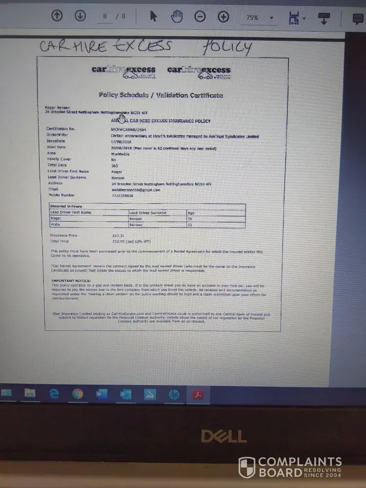 We had to then queue a third time. By this time queuing for the car hire had taken up 2.5 plus hours of our holiday, our children were getting upset and we were running late for a family gathering which we were attending. The assistant again reiterated that by taking the insurance policy the problem would be resolved. At this point we felt that we had no option but to take the additional insurance policy so we were charged €320.19 which can be seen on the attached invoice.