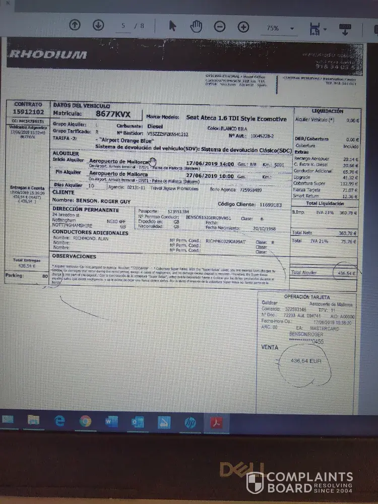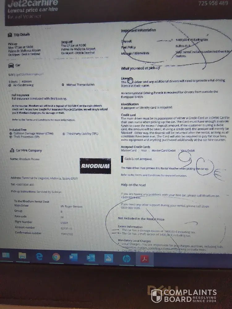 Complaint is made on the grounds that we were forced to pay an extra 436.54 euros to be allowed to collect our hire car, having already pre-paid for the hire online in the uk through jet2carhire.com. (booked with rhodium, whose desk at palma is operated by goldcar.