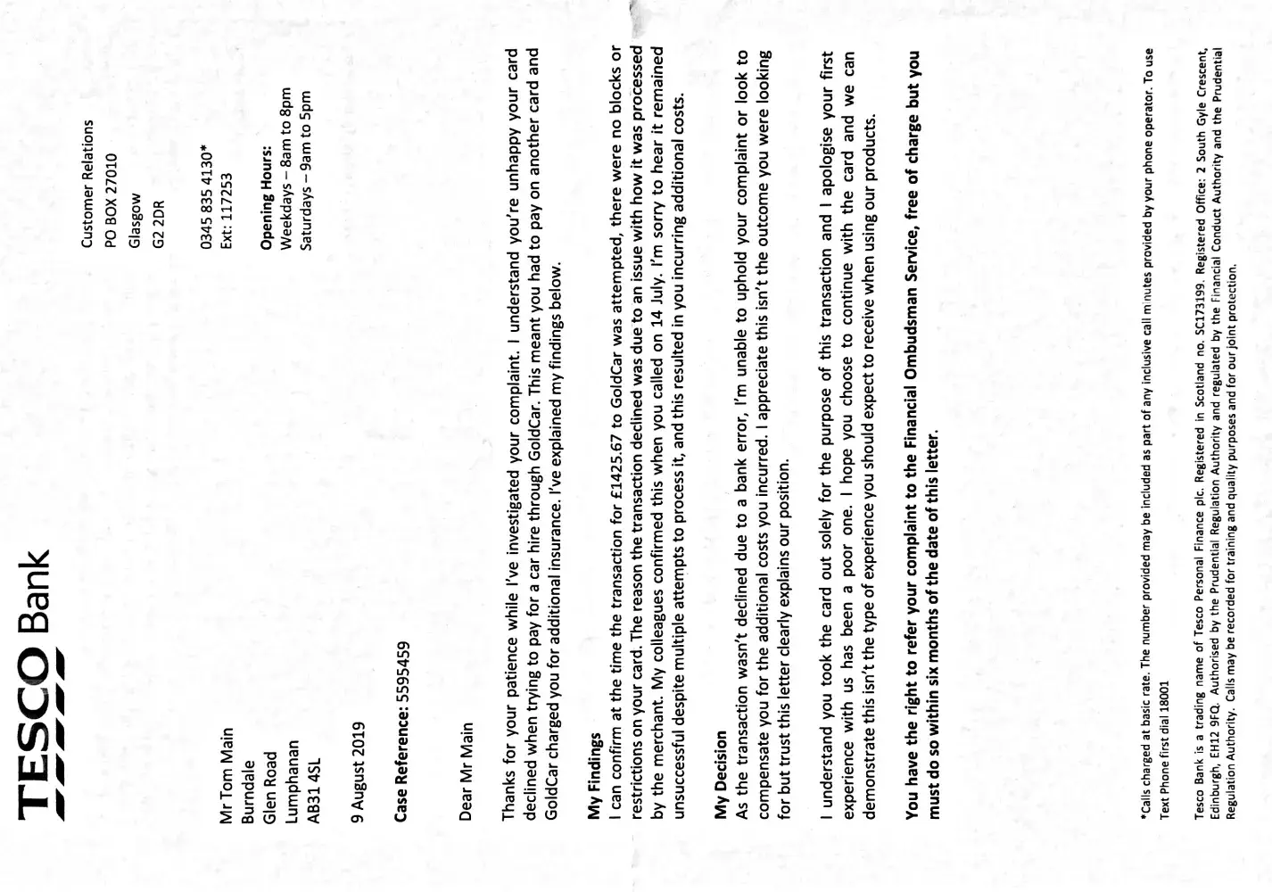 When the card transaction was attempted it was declined. We then had to come out of the queue and called our bank (TESCO Bank) to clarify the situation. We were advised that there was no issue at the bank at that the issue was with GoldCar.