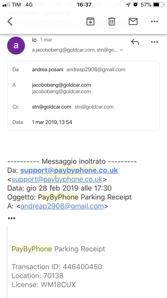 Attached email sent to the goldcar operator including a further request of clarification on April 16th, the rental agreement, Proof of payment for the parking and copy of parking charge notice.