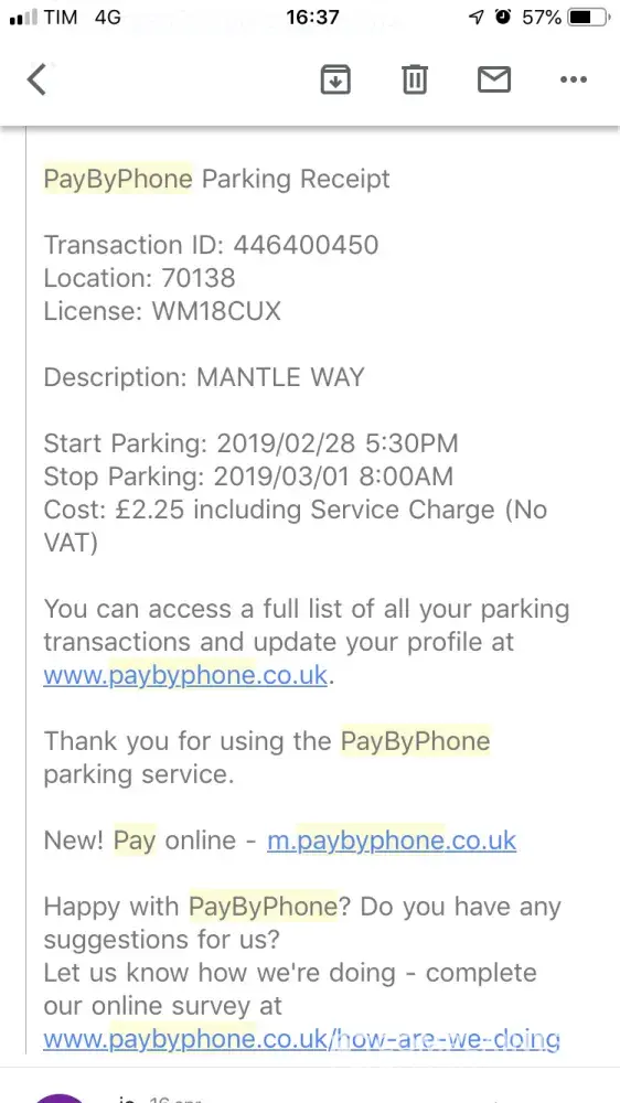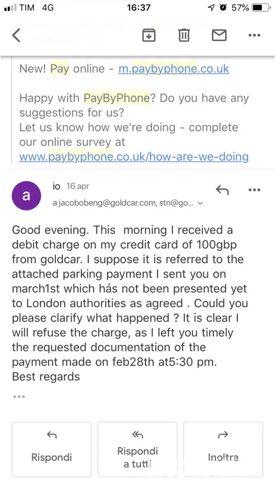 When I delivered back the car at Stansted office I adviced the operator at Goldcar office to have received a wrong penalty charge on February 28 at 21:45. The operator scanned the Parking charge notice and I sent at the same time the proof of payment made via paybyphone.co.uk . I've been reassured nothing more was due from my side. Despite of this I received a penalty charge of 100 GBP from Goldcar in April which is not due.