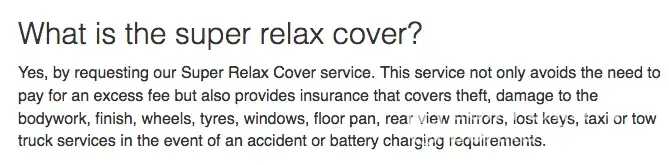 Yes, by requesting our Super Relax Cover service. This service not only avoids the need to pay for an excess fee but also provides insurance that covers theft, damage to the bodywork, finish, wheels, tyres, windows, floor pan, rear view mirrors, lost keys, taxi or tow truck services in the event of an accident or battery charging requirements.