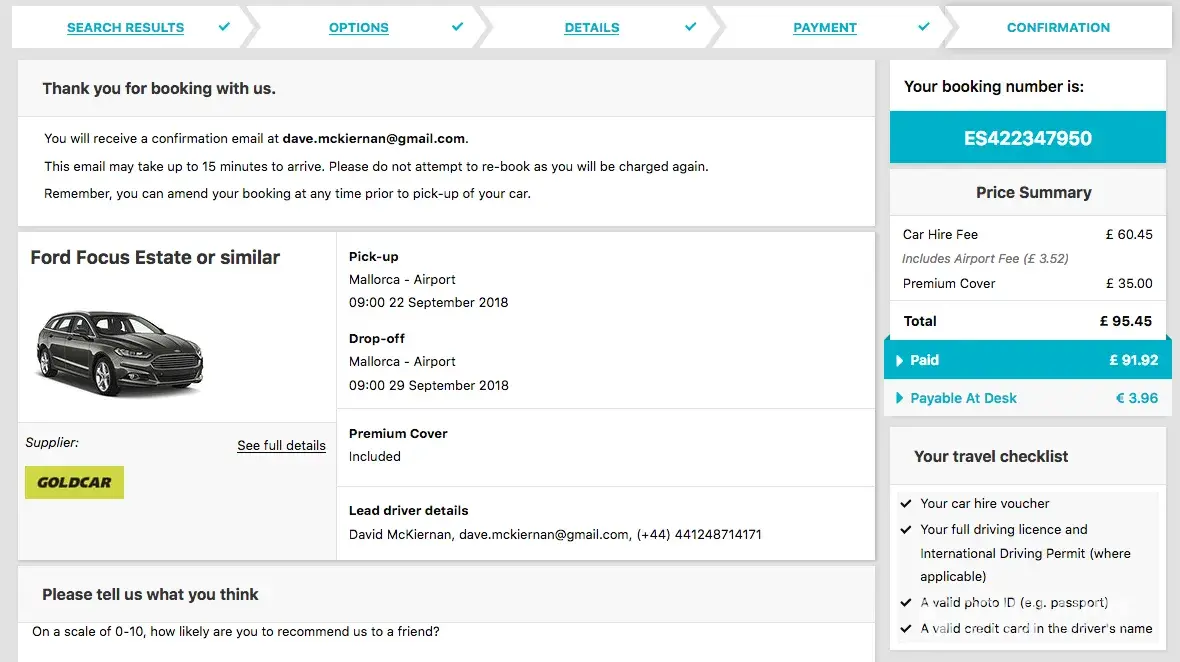 I booked a Ford Focus Automatic (which we had hired from them before) with this company for the period 2nd September to 30th September 2018 (28 days), with the fully inclusive insurance package.