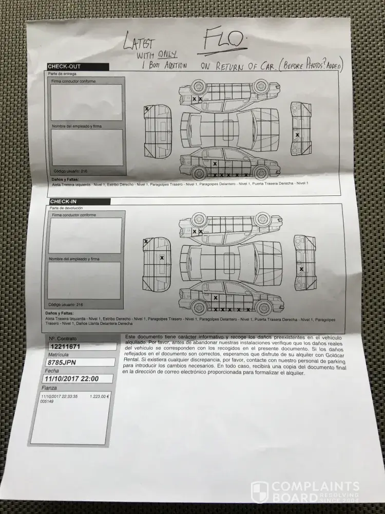 The car was booked to be returned at 5:30 and no one was serving out of hours, so I had to push the key through the letter box on the office door as I had a flight to catch. This means I had no signed check in document. Two days later I got email from Goldcar claiming I've done three scratches. One on bonnet which cost €250, one on front door €200 and one on rear door €200. Well, I've been parking in underground expensive car parks to avoid this as on street parking in Gran Canaria is worse than in London. Funny enough they did not find any of the damages which I had signed.