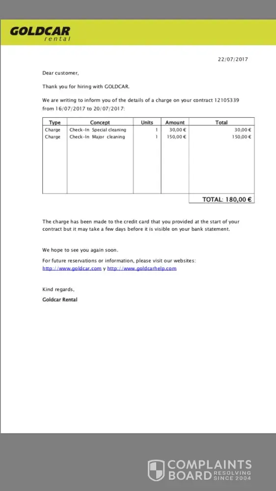 I rented a car for 4 nights on the 16/07/17 in lisbon airport, i had the car for 2 nights and had to return it as my girlfriend got some bad news and we had to travel home early so I returned the car on the 20/07/17. On the return i was told that car "Might" need to get a special clean as there was some sand on the carpets costing €30, as we were in a rush to catch the flight as we had booked last minute i didn't have any time to discuss this with her. it was just a small bit of sand from bottom of shoes and cars should be hoovered anyway between rentals. I had to run to catch the flight and didn't say anything, Today on the 21/07/17 i received an email from goldcar telling me that i have been charged €30 for a special Cleaning and another €150 for a major cleaning! Firstly how can i be charged both types of cleaning, its either one or the other and secondly why am I getting charged for a major cleaning? 30 seconds with a hover and the car would be spotless, this is disgraceful and very unfair considering the reasons why we had to cut our holiday short. I request the return of the extra €150 you charged my credit card, I am willing to pay the €30 since the lady at the desk said I might have to pay it, But to add an extra €150 on top of that as well is not fair. my Client number is [protected]
