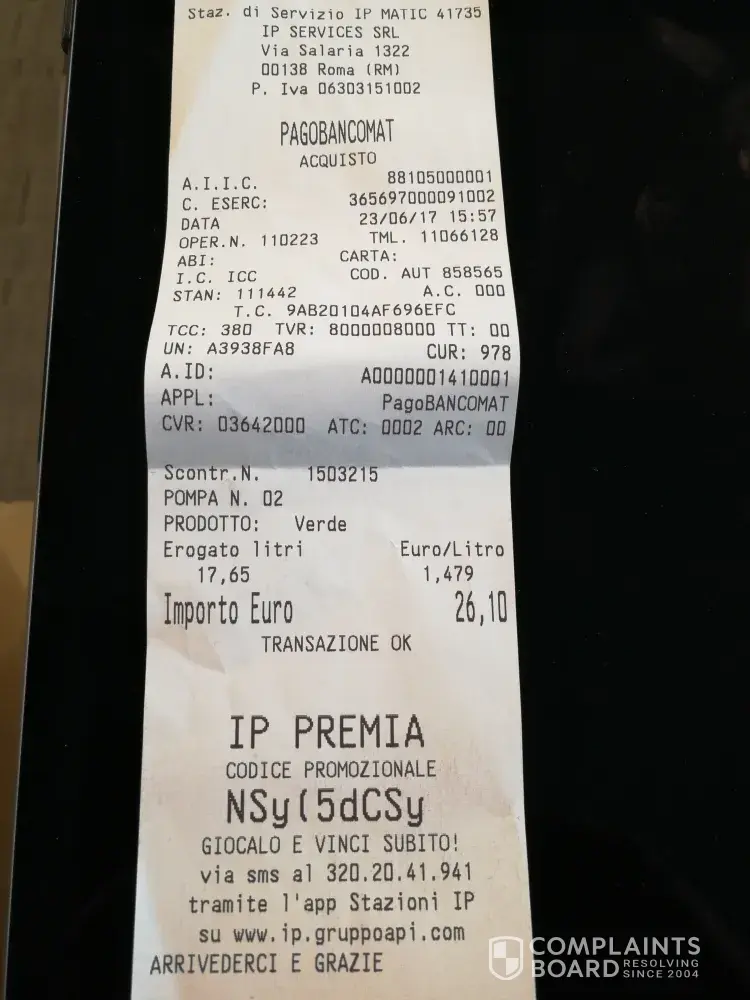 Allego copia dello scontrino della stazione di servizio IP Service ove ho eseguito il pieno alle ore 15:57 del 23-06-2017, poco prima di riconsegnare l'autovettura a Fiumicino.