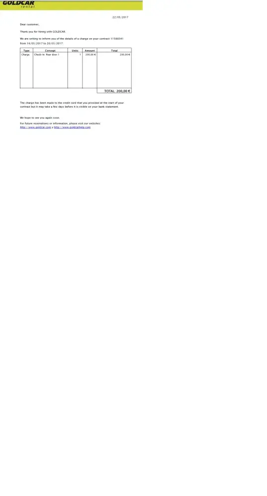 We request the urgent refund of this 200€ charge which is a fabricated damage by Goldcar.
