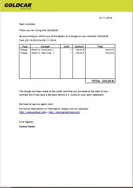 You have requested a clarification of a charge made to you. After reviewing your rental agreement, we wish to confirm that the charge of €590 that you refer to, corresponds to bodywork damage, detected in the vehicle, during a check carried out when it was returned.