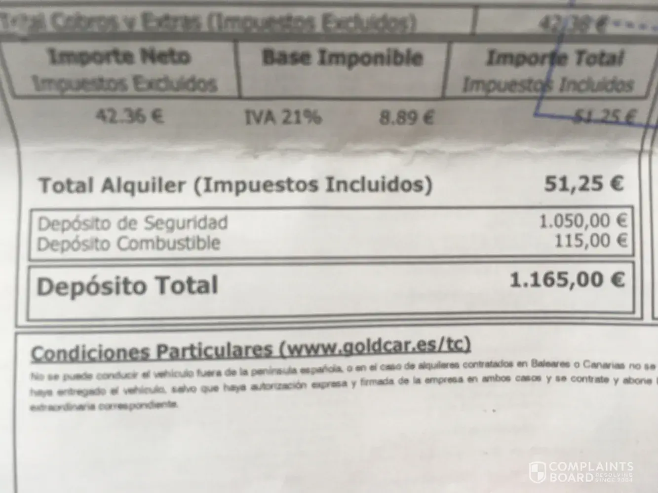 At the Goldcar desk I paid €368.60 and was told this included a damage deposit and fuel deposit, all reimbursable if car returned with a full tank and in damaged. Contract number provided was [protected] dates 24/7/20.