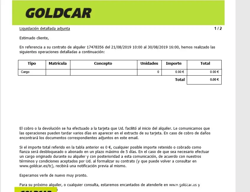 As i returned the car, the payment was not refunded. I contacted the Goldcar service.