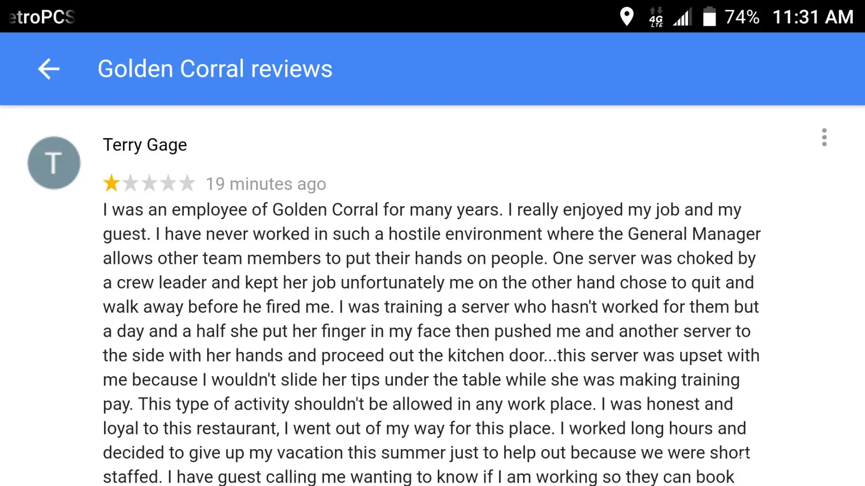 You can view my complaint on Golden corral in Columbus Georgia web site...reviews. look for the T...I was a long time employee and I want answers as to why other team members are allowed to put there hands on people and still keep their jobs. I couldn't seem to get the owner, human resources, or the district manager to return my call about my concerns...if at all possible can someone from corporate office love me answers...please and thank you![protected]...Terry Gage