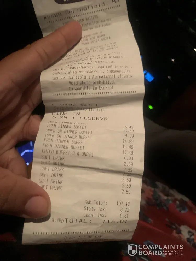 We had a carry out and I paid $20.00 for it. The food tasted like old grease. Not just one thing but everything but the ribs because they were OK. I won't ever go back and spend that much money again at Golden Corral.