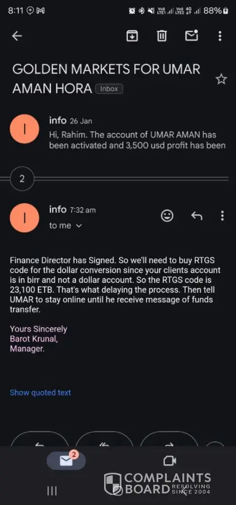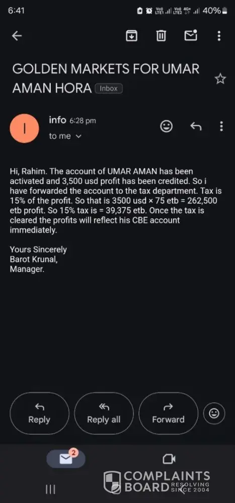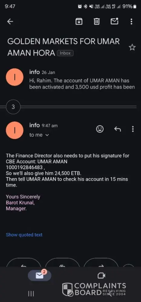 My complaint was that a company called golden market in january 26/2024 invested two hours of online trading. Then he spent a total of 10,2975 etb while being told to send so much tax, send so much rtgs, send so much proxy signature. If I ask, they tease me and tell me to stay online if you're done sending what we said. Therefore, I kindly request the concerned authorities to consider my complaint and refund my fund.