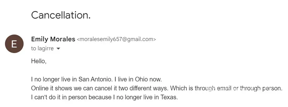 I've been trying to cancel through email but no response, called the property, they told me I had to come in. I told them I live in Ohio now. I can't come in.