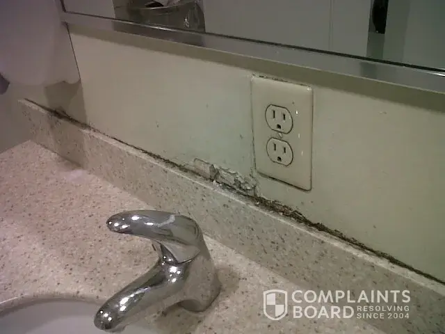 But, in all honesty, I could deal with that stuff. The biggest issue I have is the sink area in the toilet area. Since I started, the backsplash to the sink area consists of dirty rotten drywall, nearly exposed wiring on the tileless backsplash. Take a look at the picture I took myself just this morning. It is not doctored. I have been there 5 months, and figured they must be aware of it and would have a contractor booked to come to do the repair soon... Nothing yet...