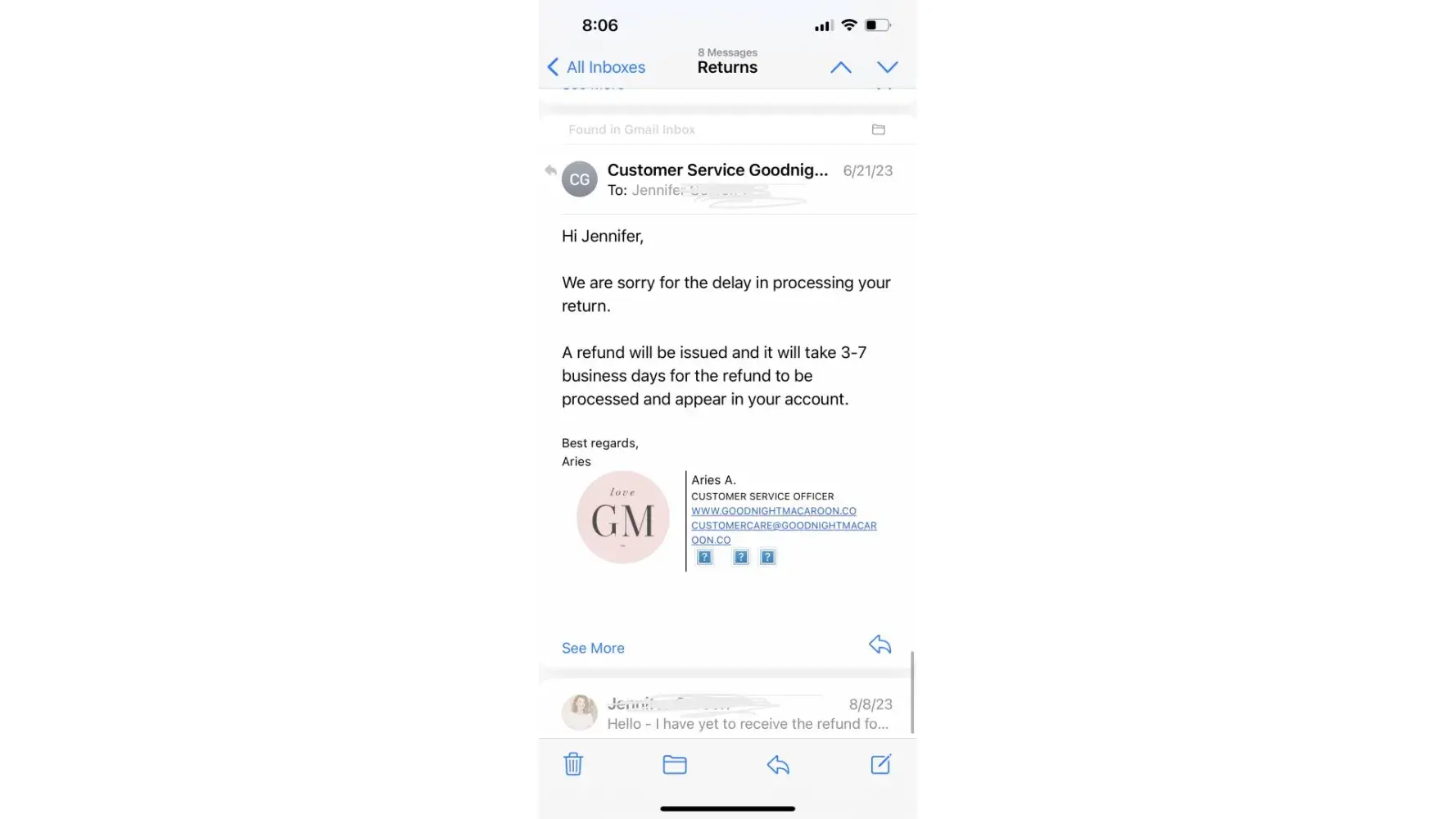 Goodnight Macaroon ARE SCAMMERS. I placed an order in April 2023, when it arrived the quality was TERRIBLE and it was missing some items from my order. I started a refund in May and followed all of their instructions, including paying for the shipping and sent them a copy of the receipt with tracking number. They replied saying they’d process the return and it would take 3-7 business days for the refund. I’ve never received a refund and they have ignored all emails since. They took back the merchandise, after not shipping the full order to begin with, and NEVER processed the refund. They stole $250.60 from me plus the $17.38 I spent to ship it back to them. DO NOT BUY FROM THIS COMPANY!