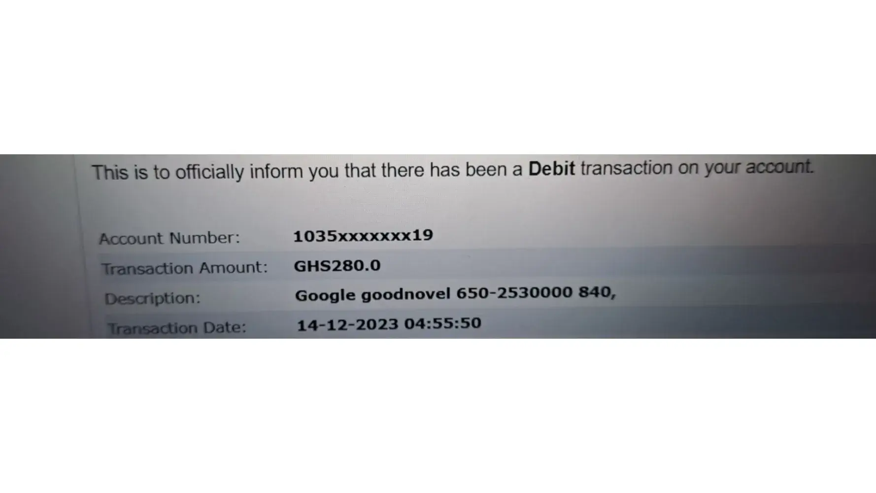 On the 14th December, 2023, at 4:55 am, amount of GHS280 was deducted form my account when I had not approve such a transaction. The description given was Google goodnovel [protected]. I also checked my goodnovel account and it has not translated into coins but it has not translated into coins.
