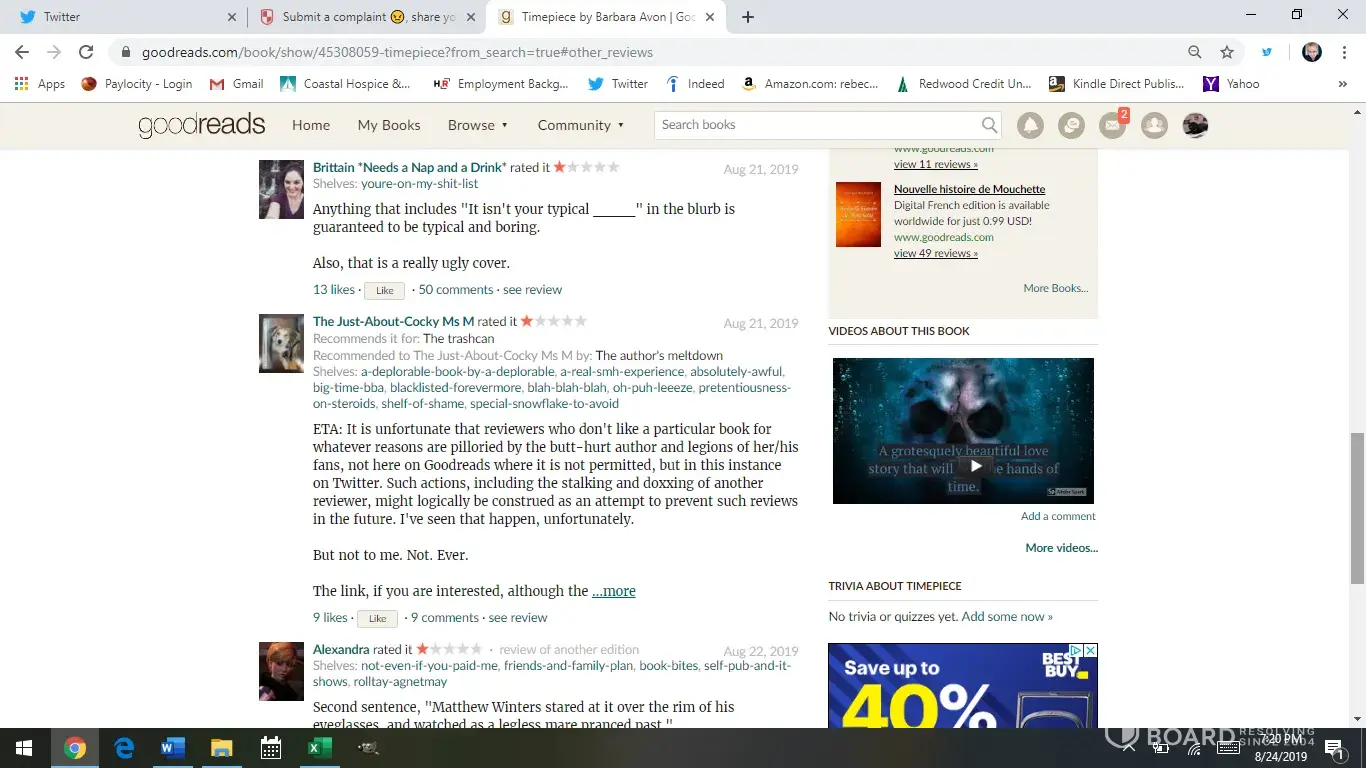 This woman is over 65. Another woman over 50 gives me a detailed editing assessment review and a 2 star. Still, she told the whole story and details so everyone will know what the book is about so they won't read it, and she posted the review on Amazon and Barnes & Noble she said there are missing words the grammar is terrible. I am going over the book because I am doing a screenplay, and the syntax is excellent. Her kindle machine is an old version because I haven't found any missing words. Good Reads warmed me not to say or respond to the reviews, but they are protecting the reviewer who says anything they want and discourages other readers, which infringes on the writer's rights and destroys their sales. If there are any errors I will fix them, but I won't be spending another $400 on GoodReads the positive thing out of this whole ordeal I was going to pay $1, 000 in giveaways but those two reviewers attacking me blew it for GoodReads, and I will complain, to Amazon to take their reviews off of my books page. Most of the readers are writers and sour grape editors who can't get a job. They better not come after me on twitter I have 32, 000 followers I'll turn into a warrior and crush them and their reputation a bunch of freeloaders.