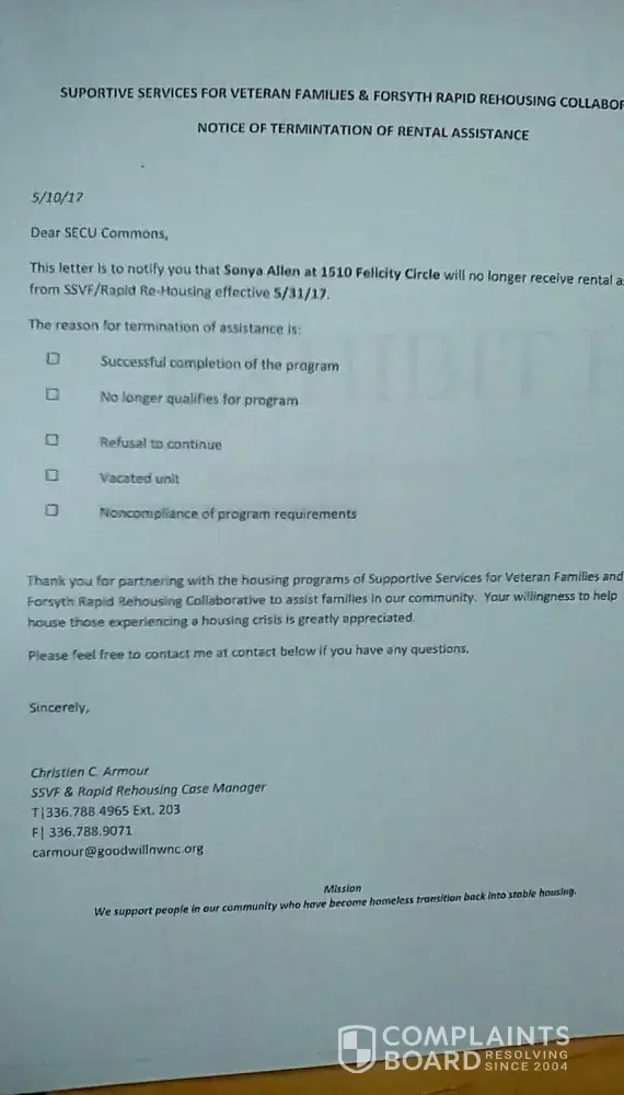 My family was in Rapid Re-Housing in Winston-Salem N.C. We was at the Salvation Army Center of Hope. Christian Armor was my case manager. I got a place at SECU Commons. Christian ended my assistance. I have found through a Justice Department statement that I was only being talked about in conversation between Christian and my landlord. Resulting into my family having a money judgement put against me and being evicted. We are homeless again. No room at shelters in Winston-Salem so we had to drive to Davie County just to seek shelter. I'm feeling overwhelmed that my family has become victim to this system that was intended for homeless prevention. My children or anyone esle children deserve this.