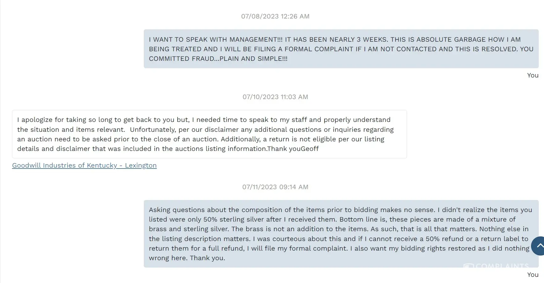 My complaint is against the Goodwill store - Goodwill Industries of Kentucky - Lexington. They sold me a jewelry lot they listed and described as "48.3 Grams Sterling Silver SS925 Mexico Wearable Bracelet & Brooches Pins". Upon further inspection and testing, I found that roughly half of the jewelry is made of brass and copper, and is not 48.3 grams of sterling silver as they listed. I understand that mistakes happen so I informed the store of my findings and sent them proof of my testing. I requested a partial refund or a return label to send the jewelry back to them for a full refund. I was shocked to see their employee Vanessa reject my return request completely, regardless of the evidence I presented. They committed blatant fraud and aren't even trying to hide it. They are trying to say the jewelry brass/copper is an embellishment, like a gemstone. Their policy states jewelry may contain embellishments. However, as can be clearly seen in the attached pictures, the jewelry is made with mixed metals. The brass/copper and sterling silver are all fused together as one piece and was not an addition. Even their manager was absolutely no help as he concurred with Vanessa's communications with me. They flat out rejected all return options and then disabled/blocked my account from further purchases. I have been a loyal Goodwill customer for decades and have purchased hundreds of products through them. Buyers BEWARE of this store! They will tell you they are selling you something desirable and will ship you a turd!