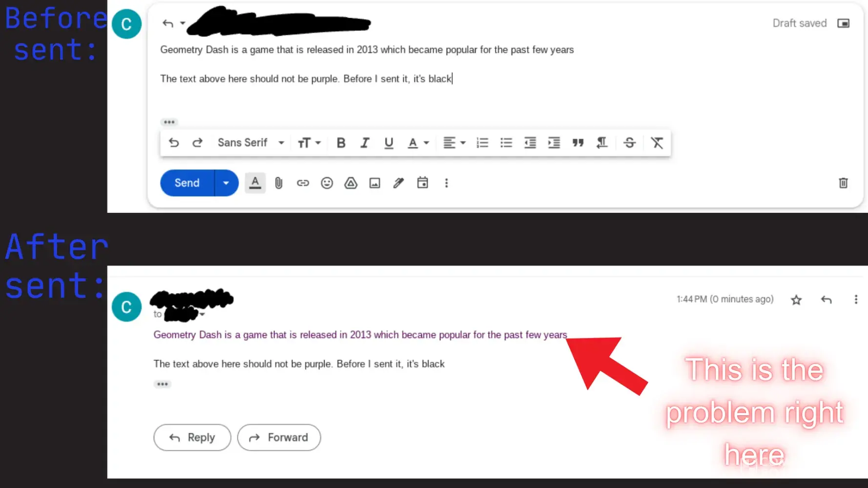 So when I was sending emails about the same thing when talking to somebody, I copied the thing and pasted it and the text was not purple. When I sent it, the text I just pasted was purple. I did not use any mods for this and the text was set to black. And I tried different ways such as Ctrl + Shift + V (which pastes the text without formatting it) which it does work in documents but not on emails when sent. When I did that, and again, it turns the pasted thing that I said before into purple. But if I add a comma between the sentence (it was a test), it did not turn purple. The thing that disappears is something weird. So when I paste a template and use the same template it again and paste the same text in the same template, it disappears. There's that one time that I warned them to stop using a template saying a warning to stop and they didn't stop and continued. So I used the same template saying the same message (nothing edited) and the message disappeared. But then, I got blamed for sending a blank message when I checked and it was gone. I double checked and it just edited my email without consent. I tried it again, double checked, then sent and it's gone. So this means that there's somebody hacking the email system (this is not just me, I seen other people having this issue in real life on where I work and I think everybody had this issue) or this is either a bug. The picture (it's edited showing before send and after sent the message and I used Canva to make this picture) I provided is a example on what I just said with before and after (when saying the same thing twice) showing the text being purple after the email being sent (not the entire email but the part I just said (this is a 2nd response))