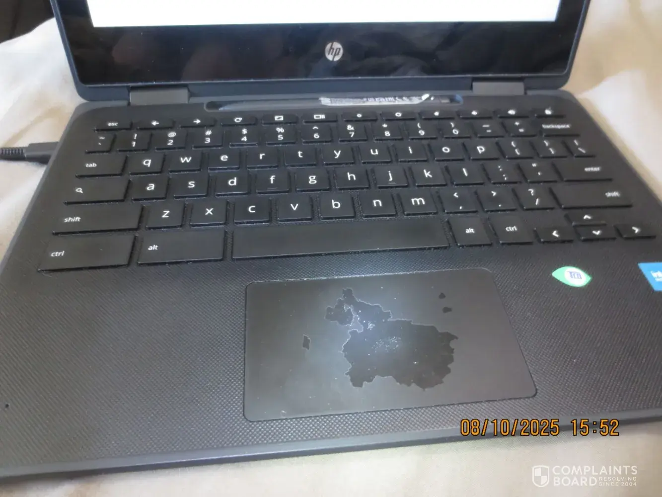 15. Trackpad being torn down: So somewhere before June 2025 (likely May 2025), I started to notice the trackpad is a bit off. And when I tried to clean it, it doesn't work. So I ignored it but it keeps expanding by wear and tear and I don't know why it does this. I did not do any damage to this but for some reason, the trackpad still works but the layer is torn down (and nobody wants that) and other laptops (that are not Chromebooks) does not have this problem. If you look at the picture, this is what it looks like (this looks like the UK and other lands connecting to Europe and it also looks like a face) (this is as of Aug 2025)