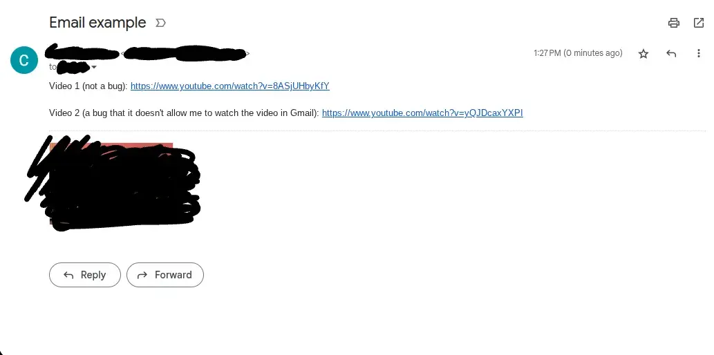 I want to add #18 to the list: There's a problem (possibly a bug) that certain videos would not appear in Gmail (YouTube links), even when the video is real. In the screenshot below, I placed 1 video mentioning it's not a bug (the video link is Fruit Ninja related) and the 2nd video link I provided is a video of Fruit Ninja glitches but for some reason, it did not appear in the video section in Gmail and it only appeared 1 video (even though, there are 2 videos). No, it's not edited as if you try this yourself, you will encounter the same issue. I don't know what triggered this because normally, all YouTube links should display all existing YouTube videos in Gmail on any links related to that but it only displayed one. If I place a different one that doesn't cause the glitch, it can appear as more than 1. Here's the screenshot below (again, it's not edited (except for contacts and my email which is hidden) and there are YouTube links in there that I provided as a sample)