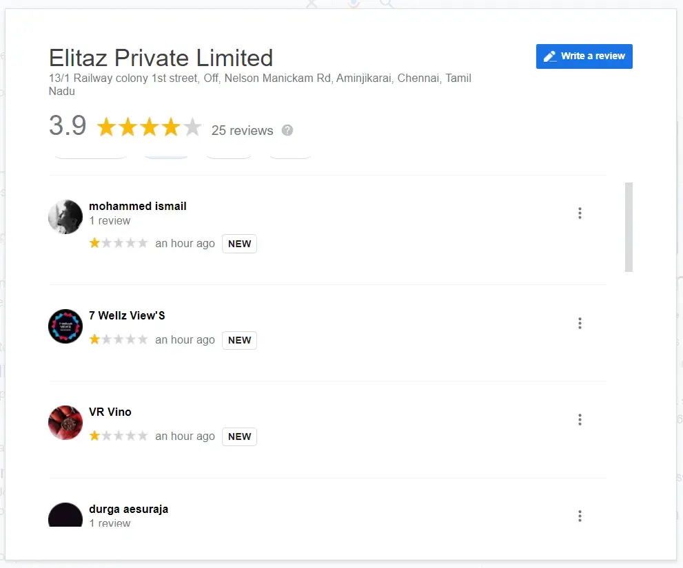 From 2/27/2022, we have started receiving negative feedback review with lowest rating on Google My Business platform on our company Elitaz Private Limited. We are located in Chennai, India.