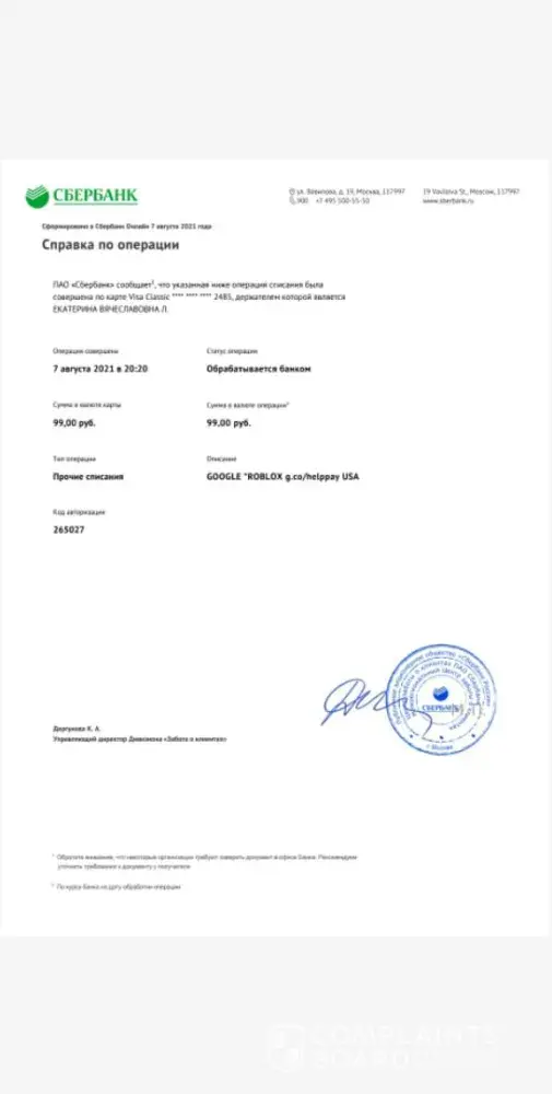 Оплатила игру Roblox, деньги Ñ Ð±Ð°Ð½ÐºÐ¾Ð²Ñкой карты ÑпиÑали, в игру деньги не пришли, Ñ‚Ñ€Ð°Ð½Ð·Ð°ÐºÑ†Ð¸Ñ Ð½Ðµ прошла. Прошу вернуть ÑредÑтва.