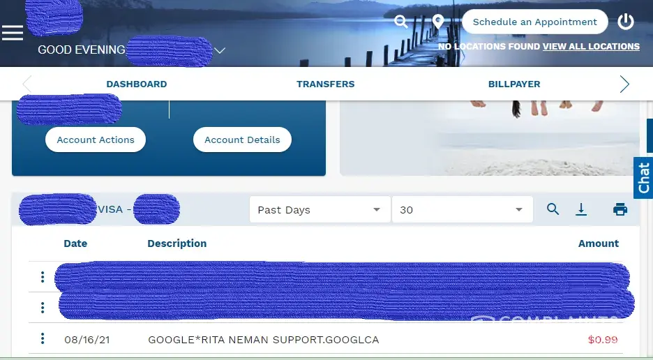 There was a debit card charge of $1.06 that posted to my bank on 8/16/21 with a description of "GOOGLE Rita Neman G.CO HELPPAY#CA".