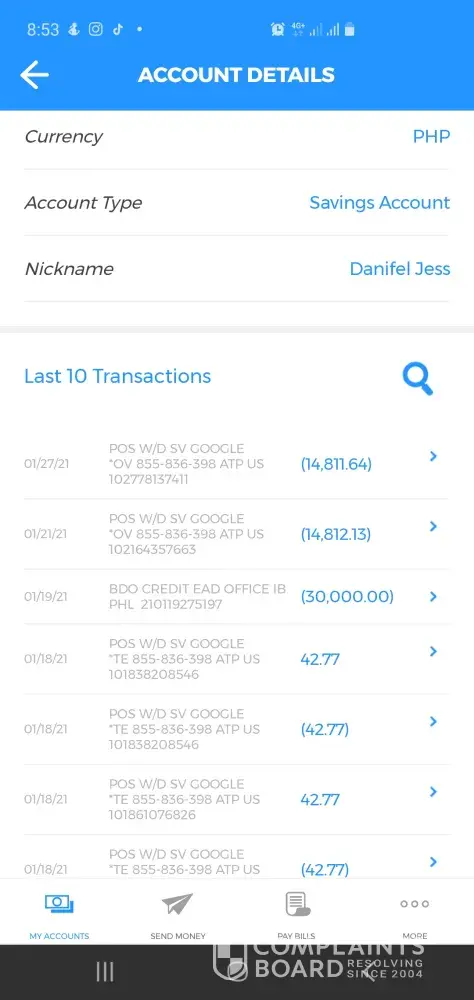I was shocked when i opened my BDO Online Banking when POS W/D SV Google, deducted 14, 812.13 pesos last January 21, 2021 and another 14, 811.64 pesos last January 27, 2021. I never remember purchasing something from google. I did not even use my debit card for quiet some time. I need reversal/refund of this as soon as possible. These are all hard earned money. I want to take it back asap.
