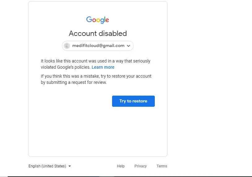 I uploaded 180 GB of my personal data on Google Drive [protected]@gmail.com & Google blocked my account stating violating of policies. Denying to return my 180 GB Data.