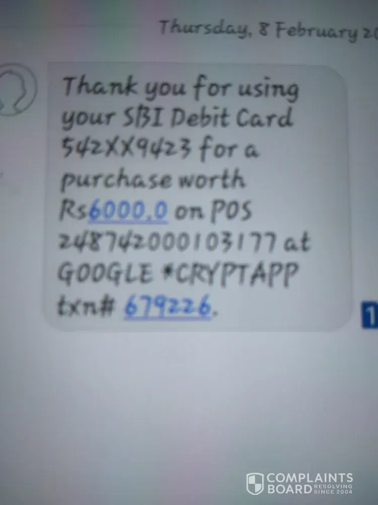Three unauthorised transaction were carried out from my debit card on 8th Feb 2018 at 4:29 pm from google*cryptapp, of three transactions: first debited Rs. 50, then Rs.5000, and subsequently for Rs 6000.