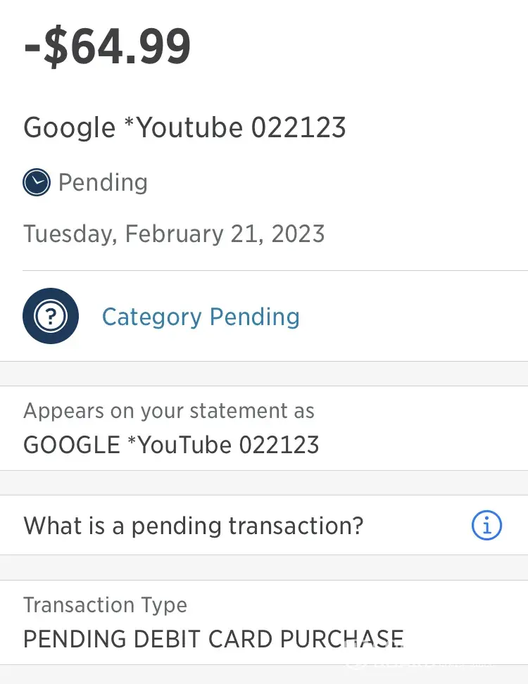 I received my tax return this morning and within 2mins a charge for $64.99 appeared from “GOOGLE *YOUTUBE 022123â€. I tried googling the transaction code, but nothing. I have USAA and TD Bank and both of them flagged my cards to fraud. In the same day within hours of each other.